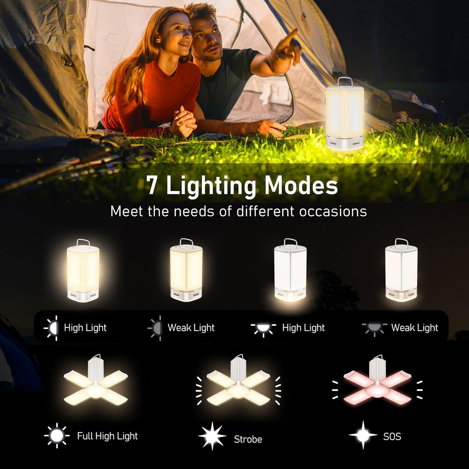 【90°Adjustable & Multifunctional】Dual-use design: in the folded state, it can be used as a portable camping lantern, with more concentrated light and more powerful lighting; unfold the 4 side lights outward 90°, it can be used as a small chandelier to illuminate a wider area. Hook design, additionally equipped with climbing buckle, convenient for campers to hang in tents, light stands, tree branches, etc., to bring the light to any corner.